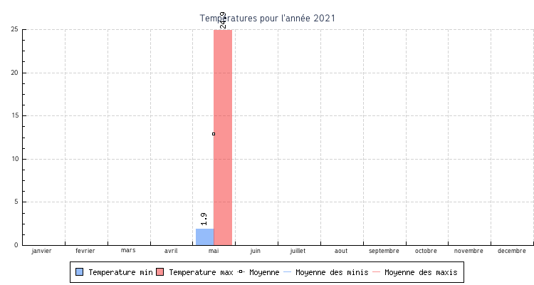 | mai | 1.9 °C | 7.8 °C | 24.9 °C | 18.2 °C | 12.9 °C | 7.5 km/h | 48.6 km/h | SO |
